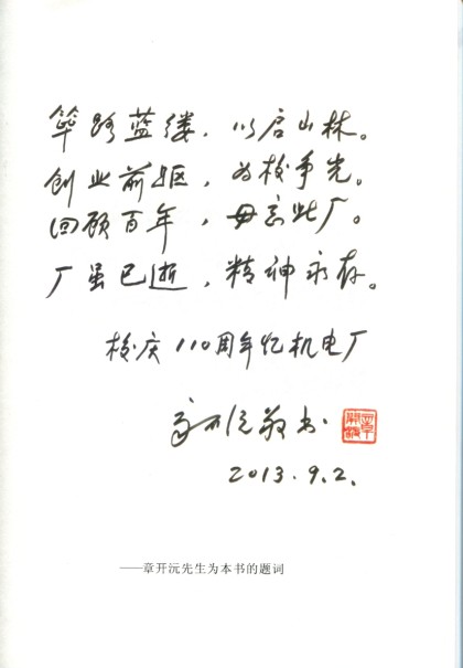 老校长章开沅、王庆生、邓宗琦、汪文汉分别为本书题词或作序,章开沅老校长的题词为:“筚路蓝缕,以启山林。创业前驱,为校争光。回顾百年,勿忘此厂。厂虽已逝,精神永存。”王庆生老校长的题词为:“校办企业创佳绩,服务社会谱新篇”。