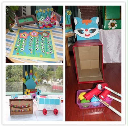 老师们化腐朽为神奇,利用废纸箱、牛奶盒、易拉罐等制作成了纸坦克、小卡车、迷你动物迷宫、有趣保龄、还有小巧可爱台球桌,教孩子们数数的鱼吐泡泡、算珠火车等等孩子们喜爱的、漂亮又有趣的玩教具。