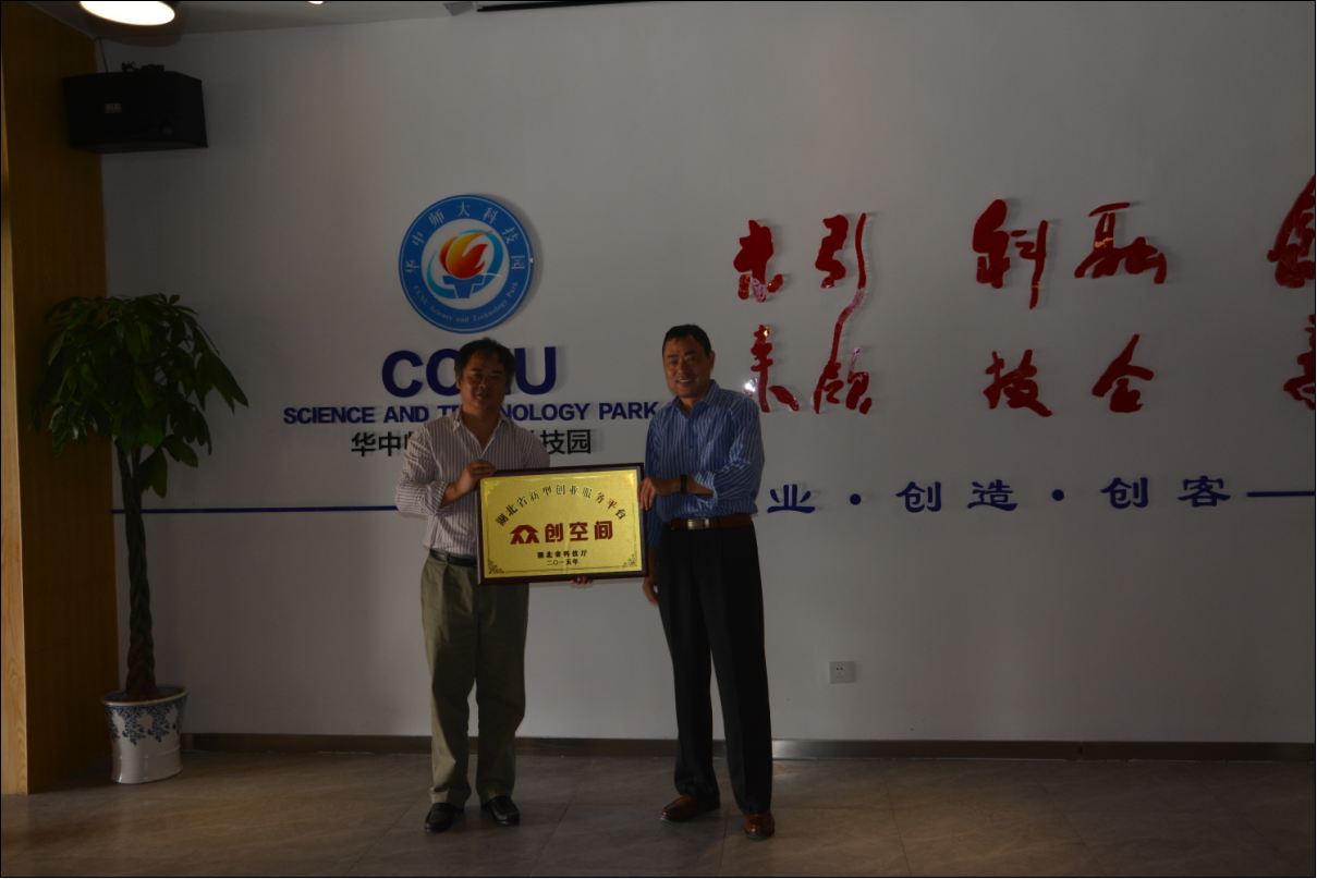 华中师范大学科技园众创空间已获得湖北省科技厅审核认定,成为首批“湖北省创新创业服务平台——众创空间”,赵东处长代表湖北省科技厅向华师科技园董事长曾浩书记授予华师科技园“湖北省创新创业服务平台——众创空间”牌匾。
