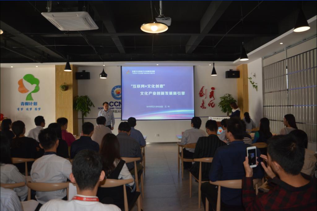 2015年10月22日上午,由湖北省科技厅、武汉市科技局指导,东湖新技术开发区科创局主办,华中师范大学科技园承办的“全国大众创业万众创新活动周光谷互联网+文化创意创新创业主题沙龙”在华师科技园博雅众创咖啡举办。湖北省科技厅协调办赵东处长,武汉市科技局政策法制处石柏林处长,东湖新技术开发区科创局钟复平副局长,华中师范大学资产经营管理有限公司书记、华师科技园董事长曾浩书记,武汉市科技局政策法制处郑慧科长、谢西璐科长,华师科技园石炜总经理与10位知名创业导师,5家创客团队,150多名园区企业家、创业者代表齐聚一堂,共话“互联网+文化创意”产业发展梦想,展示华师科技园“互联网+文化创意”产业成果,交流文化创意产业创新创业经验,探索“互联网+”背景下文化创意产业发展道路。