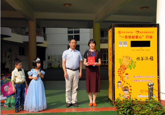 2015年9月21日早晨,伴随着五星红旗地冉冉升起华师幼儿园“一张纸献爱心”现场捐赠仪式也拉开了帷幕。各班的小朋友在老师的帮助下依次将他们收集的废旧纸张和衣物交付给湖北省慈善总会,用于资助一些有困难的儿童家庭。当天全园师生共捐赠废旧纸张430.15公斤、旧衣物数千件。