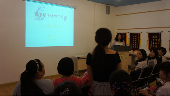 为全面提高教师职业道德素养,加强教师队伍建设,9月14日下午5点半,在保利华都幼儿园一楼多功能室,刘桂兰园长为全体教职员工做“用礼仪文化打造卓越团队”的礼仪培训。