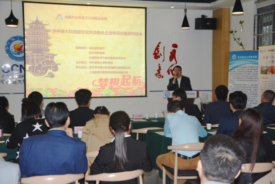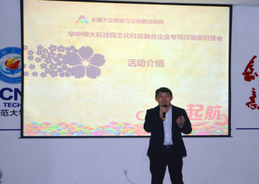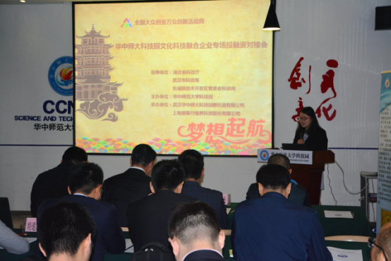 2016年10月12日下午,由湖北省科技厅、武汉市科技局、东湖新技术开发区科技创新局共同指导,华中师范大学科技园(以下简称华师科技园)主办,上海信隆行信息科技股份有限公司武汉分公司协办的“华师科技园文化科技融合企业专场投融资对接会”在华师科技园众创空间·博雅众创咖啡成功举行。华师科技园总经理石炜、华中师范大学学生工作部副部长罗高峰、华中师范大学创业中心主任丁玉斌、上海信隆行信息科技股份有限公司武汉分公司总经理韩崇胜、武汉青山优十科技企业孵化器总经理吴叶枫、今天智汇专利事务所合伙人邓寅杰组成的创业导师代表,中科招商投资管理集团股份有限公司大中华区总经理鲁烽、广州海汇湖北区投资经理彭辉、武汉点亮天使基金投资总监王会敏、武汉光谷天使创业投资基金管理公司投资经理游琼、湖北省高技术产业投资有限公司投资经理吴恢虎、DEMO投资基金投资经理何文婷组成的投资机构代表,以及中地数码集团特邀嘉宾方胡朝等组成的15人专家团队,6家路演企业,60多名园区企业家、创业者代表齐聚一堂,围绕“发展新经济 培育新动能”的双创主题,展示华师科技园在孵企业孵化成果,交流文化创意产业创新创业经验,共话文化科技融合企业发展前景,探索文化创意、科学技术、投融资本的融合发展。