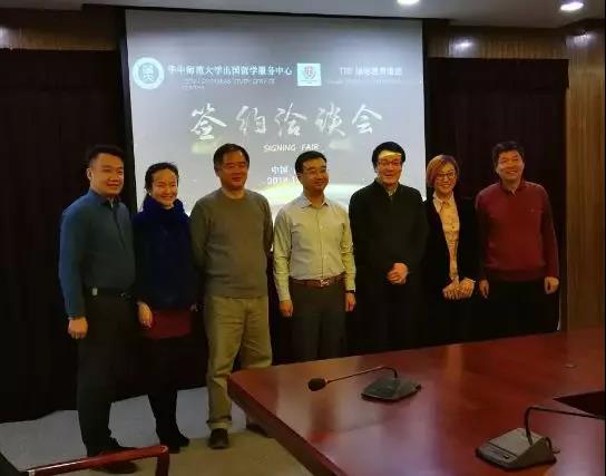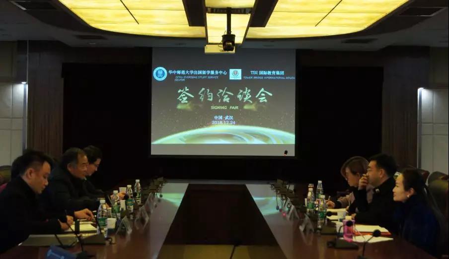 (通讯/摄影 留服中心)2018年12月24日下午,华中师范大学出国留学服务中心与TBI国际教育集团合作签约仪式在逸夫会议中心二楼会议室成功举行。华中师大资产经营管理有限公司党委书记、董事长曾浩、总经理曹青林、副总经理朱虹,华中师范大学出国留学服务中心主任胡慧洁, TBI国际教育集团总裁刘恋,中国区总裁王兰君等出席签约仪式, 胡慧洁主持签约仪式。