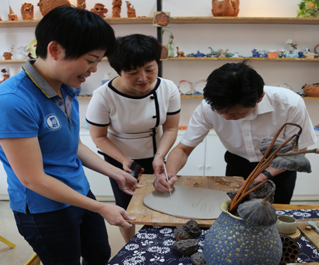 园长刘玉平率园班子成员陪同赵凌云一行实地考察了幼儿教室、幼儿食堂、户外活动场地、教师办公区及陶艺馆、美术室、绘本馆等功能室,每到一处赵凌云都认真聆听、详细询问、亲切交流。