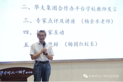 杨金水老师点评张皓月老师的汇报并作专题讲座。杨老师首先感谢华大教育集团的盛情邀请,感叹自己有幸参加了一次很有时代特色的教研活动。接着他表示,看了本次展示的单元作业设计,觉得很受鼓舞,他认为老师们的这些探索很有价值。