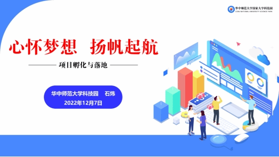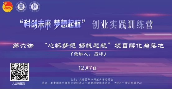 2022年12月7日中午,由共青团华中师范大学委员会主办,共青团华中师范大学经济与工商管理学院委员会、华中师范大学“经石”学习发展中心承办的“科创未来 梦想起航”创业实践训练营第六讲《项目孵化与落地》于线上顺利举行。华中师范大学资产经营管理有限公司副总经理、华师科技园总经理石炜应邀为华师创新创业训练营学员们做题为《心怀梦想扬帆启航——项目孵化与落地》专题报告。本次活动由华中师范大学经济与工商管理学院团委书记岳峥嵘老师主持,吸引了百余名训练营学员与部分非营员在校大学生参加。