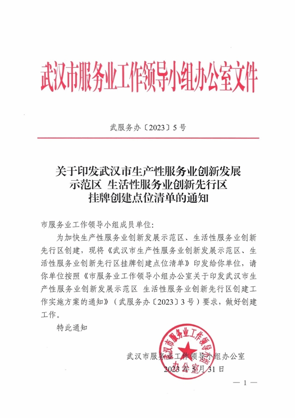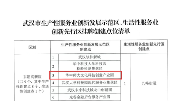(华师科技园 刘雯玉讯)近日,武汉市服务业工作领导小组办公室公布了“2023年武汉市生产性服务业创新发展示范区”38家挂牌创建点清单,华中师大文化科技创意产业园成功入选并获授牌。