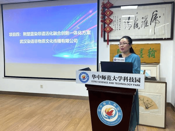 武汉染语非物质文化传播有限公司创始人王妮副教授做“荆楚蓝染非遗活化融合创新一体化方案”项目路演