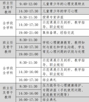 课程内容包括教学常规培训:内容着眼于明确学校教育、教学工作的基本流程规范、要求和教师的基本职责,规范新教师的教育教学行为;教学技能培训:着眼于培养教师将理论运用于实践和掌握教学基本功的能力,进行备课、说课方法的训练,通过授课教师讲座、示范课展示、教学指导、职业规划,以及参训老师的集体备课和经验交流全面提升教师业务能力;以班主任和骨干教师为主的心理健康培训:旨在向班主任及骨干教师普及心理健康知识,帮助了解学生心理保健常识,及时识别学生心理健康异常现象,初步掌握简单的心理调节方法。
