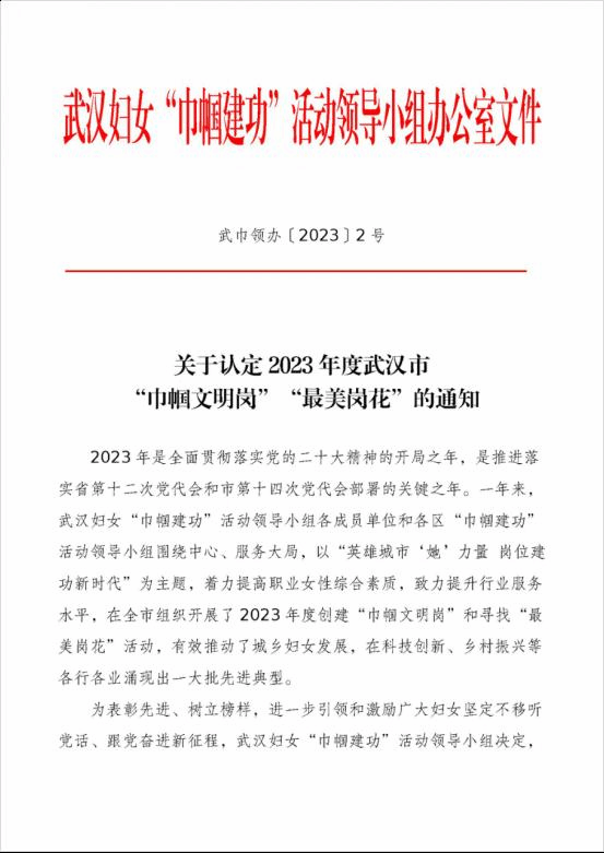 (华师科技园 刘雯玉讯)11月13日,武汉妇女“巾帼建功”活动领导小组办公室发布《关于认定2023年度武汉市“巾帼文明岗”“最美岗花”的通知》(武巾领办〔2023﹞2号),华中师范大学科技园创新创业服务小队喜获2023年度武汉市“巾帼文明岗”荣誉称号。
