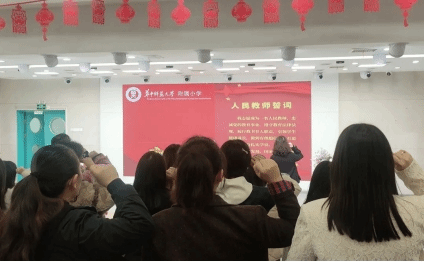 开班仪式在华中师范大学附属小学举办,伴随着庄严的国歌声,教师们进行庄重宣誓,承诺为教育事业贡献自己的力量。