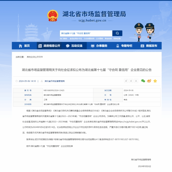 湖北省市场监督管理局开展的“守合同 重信用”企业评选,是对企业质量管理、信用管理、合同签约、履约、社会信誉等方面的综合评价,旨在规范企业合同行为,推进企业诚信建设,引导企业诚信履约、合规经营。