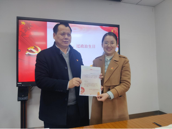 随后,石炜为十二月份入党的老党员石佳钰同志颁发政治生日卡,肯定了她作为一名具有12年党龄的党员在平时工作和生活中牢记党员身份,服务企业发展的优秀成绩,并希望她能在今后的工作中继续发扬共产党员先锋模范作用,进一步为公司党支部建设和华师科技园的发展做出新的贡献。