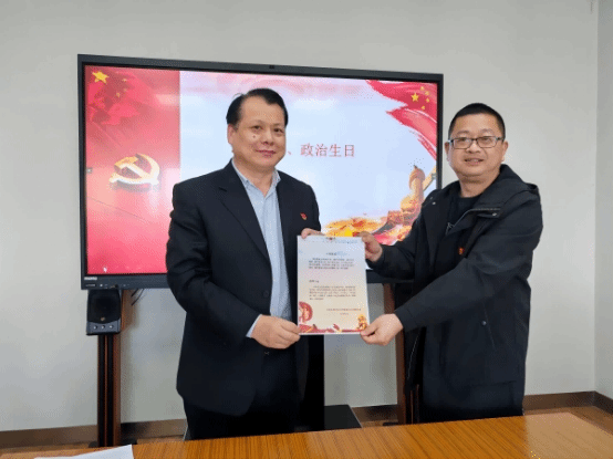 鲁明代表党支部向石炜同志发放了3月份党员政治生日贺卡。