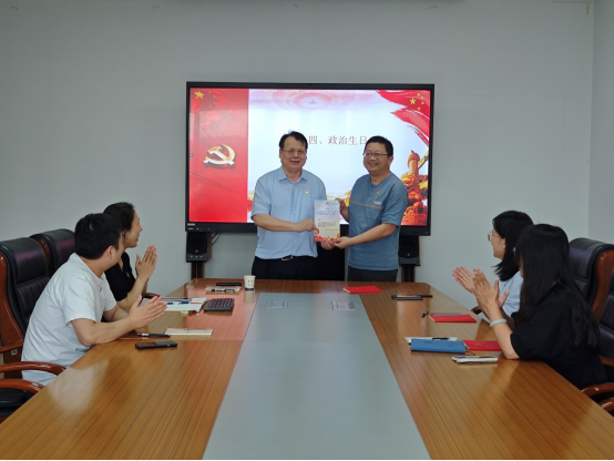 石炜为庆祝入党一周年的鲁明同志赠送了政治生日贺卡,以此表彰他作为正式党员一年来的辛勤付出和不懈努力。石炜鼓励鲁明同志继续发挥党员的先锋模范带头作用,为华师科技园高质量发展贡献力量。