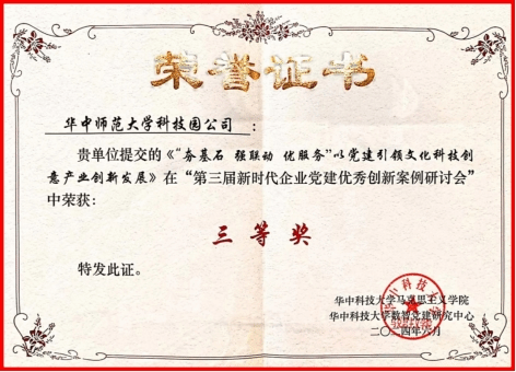 中共华中师范大学委员会连续3次授予华师科技园公司党支部“2017-2019年度先进党支部”、“2019-2021年度先进党支部”、“2021-2023年度先进党支部”荣誉称号。华师科技园党建和业务工作融合发展,企业党建工作促进了园区高质量发展,华师科技园成功培育出91家次国家“高新技术企业”、41家次武汉东湖高新区“瞪羚企业”、19家武汉市科技“小巨人”企业、14家武汉“光谷3551创业人才”企业。华师科技园已建设成为国家大学科技园、国家级科技企业孵化器、国家级文化和科技融合示范基地、武汉国家现代服务业数字内容产业化基地和全国版权示范园区,国家科技部、工业和信息化部连续7年考核评选华师科技园均为“全国优秀国家级科技企业孵化器”,累计获得国家级、省市区重要资质和荣誉75项。