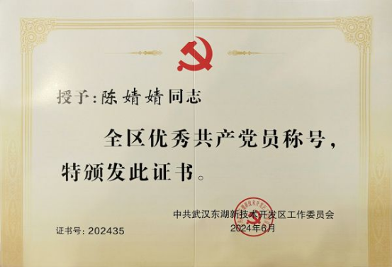 (华师科技园 刘雯玉讯)7月2日,中共武汉东湖新技术开发区工作委员会召开武汉东湖新技术开发区“两优一先”表彰大会,华师科技园企业服务中心副主任陈婧婧荣获武汉东湖高新区“全区优秀共产党员”荣誉称号。
